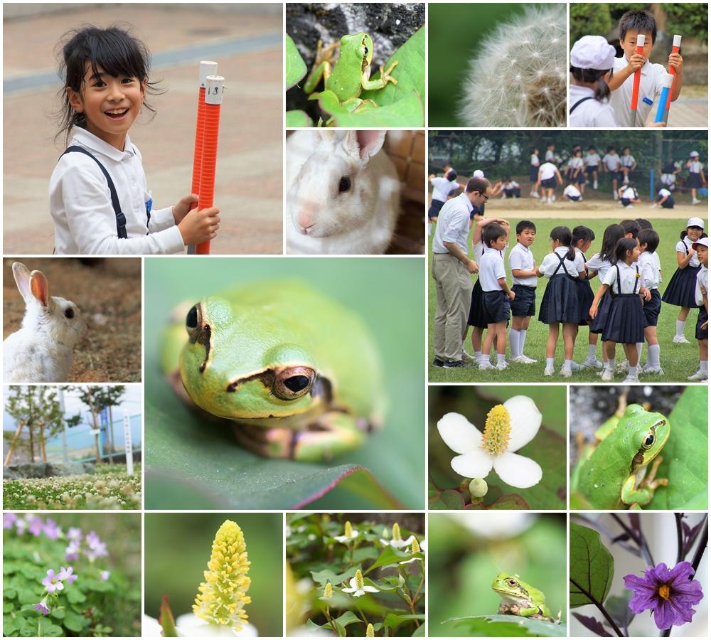 雨が降ると、アマガエルがセットですよね(〃´∪`〃)ゞ 松柏小学校には本当にたくさんのアマガエルが暮らしています。カエル、苦手な人も多いようですが、あの大きなつぶらな瞳、つるつるの肌、まあるいおなかに大きな手。愛らしくて、ついなでなでしたくなっちゃいます。もちろん、我慢して写真だけ撮らせてもらいました(^-^;